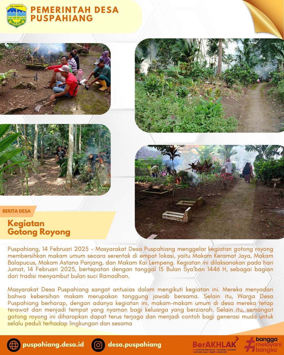 “Kegiatan gotong royong ini merupakan tradisi rutin yang kami lakukan setiap tahunnya menjelang bulan suci Ramadhan,” ujar Bapak Kepala Desa Puspahiang. “Selain sebagai bentuk penghormatan kepada leluhur, kegiatan ini juga bertujuan untuk menjaga kebersihan dan keindahan lingkungan makam.”