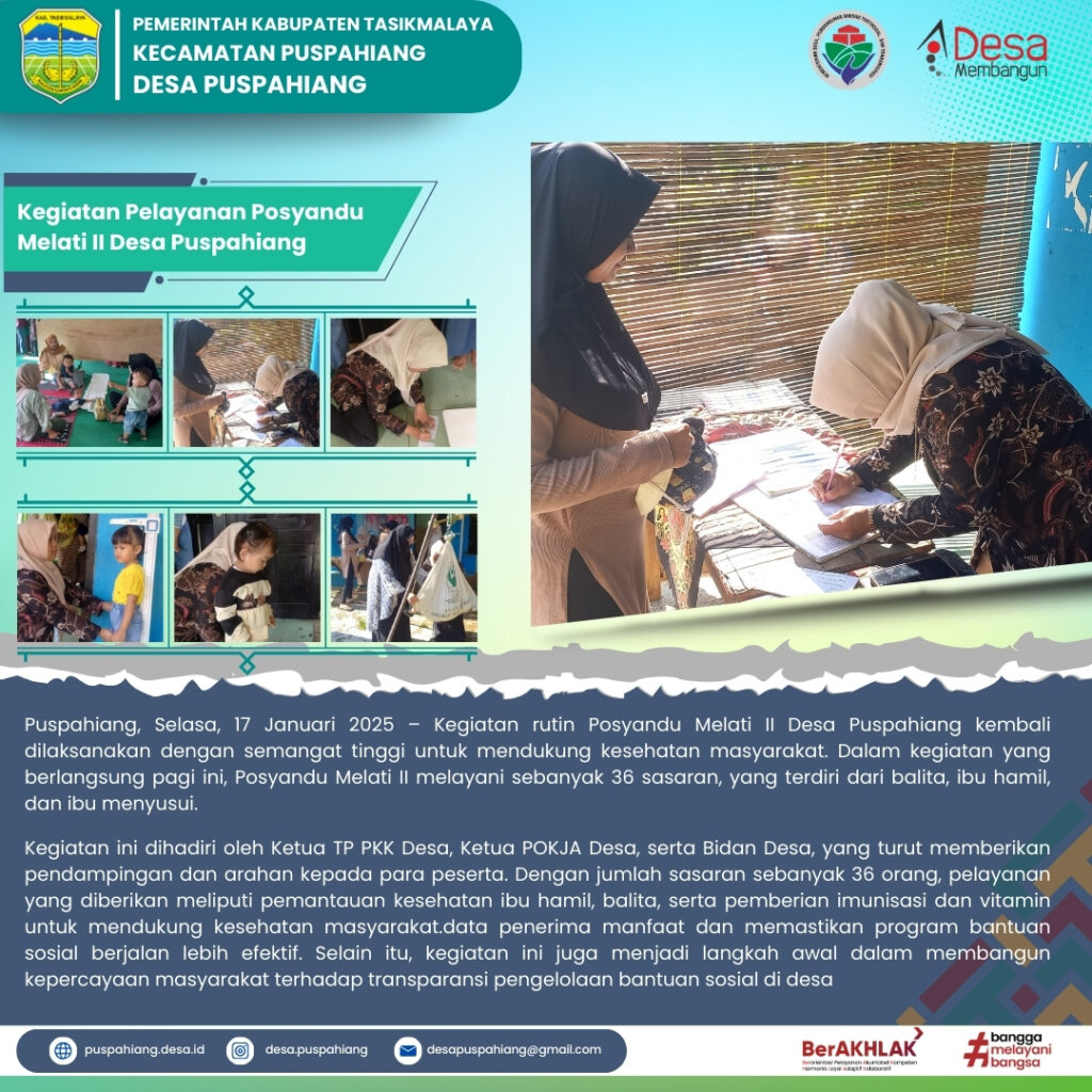 Dengan dimulainya program pelayanan kesehatan melalui Posyandu ini, Desa Puspahiang menunjukkan komitmennya untuk terus meningkatkan kesejahteraan masyarakat. Kegiatan ini diharapkan menjadi langkah awal yang baik menuju tahun yang lebih sehat dan produktif.