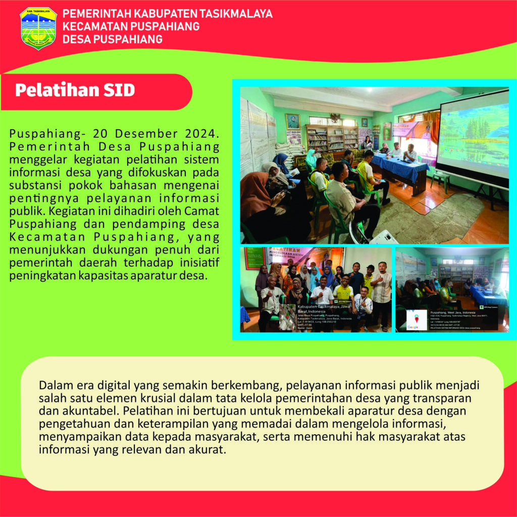 Puspahiang- 20 Desember 2024.  Pemerintah Desa Puspahiang menggelar kegiatan pelatihan sistem informasi desa yang difokuskan pada substansi pokok bahasan mengenai pentingnya pelayanan informasi publik. Kegiatan ini dihadiri oleh Camat Puspahiang dan pendamping desa Kecamatan Puspahiang, yang menunjukkan dukungan penuh dari pemerintah daerah terhadap inisiatif peningkatan kapasitas aparatur desa.