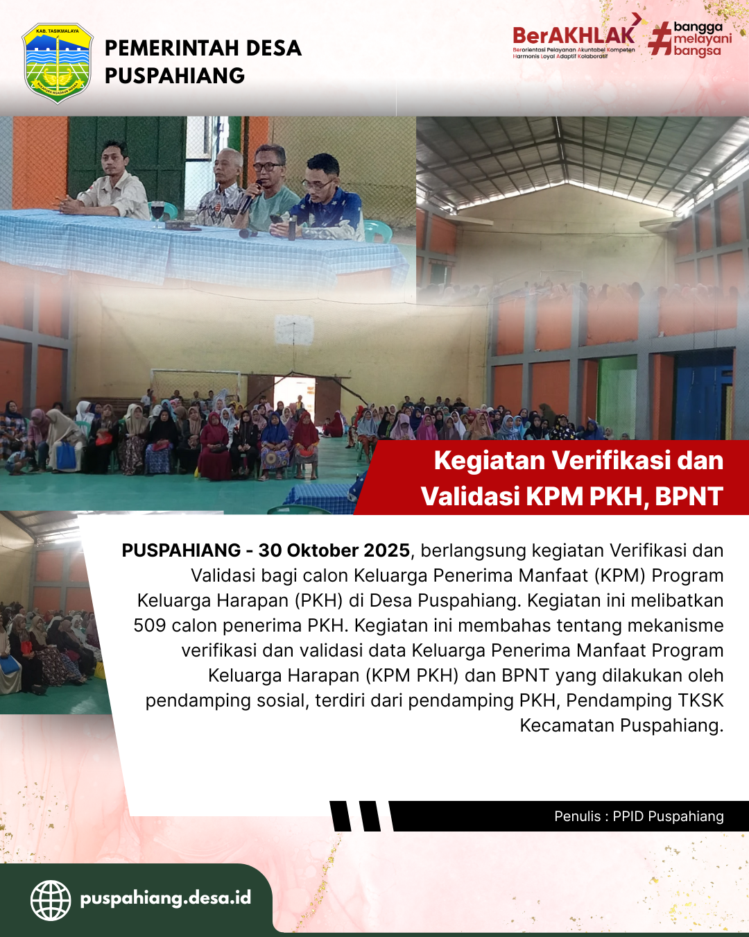 Puspahiang, (Kamis, 30 Oktober 2025) – Upaya memastikan bantuan sosial (Bansos) pemerintah tepat sasaran kian diperketat. Hari ini, Desa Puspahiang memulai kegiatan Verifikasi dan Validasi (Verval) bagi 509 calon Keluarga Penerima Manfaat (KPM) Program Keluarga Harapan (PKH) dan Bantuan Pangan Non Tunai (BPNT).