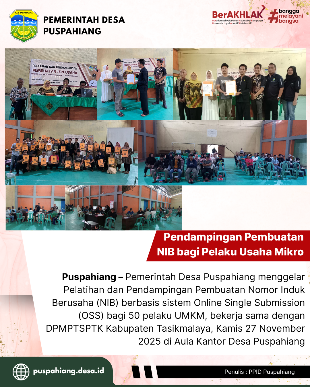 PUSPAHIANG – Pemerintah Desa Puspahiang menggelar Pelatihan dan Pendampingan Pembuatan Nomor Induk Berusaha (NIB) berbasis sistem Online Single Submission (OSS) bagi 50 pelaku UMKM, bekerja sama dengan DPMPTSPTK Kabupaten Tasikmalaya, Kamis 27 November 2025 di Aula Kantor Desa Puspahiang.​
