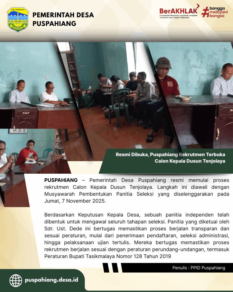 PUSPAHIANG – Pemerintah Desa Puspahiang resmi memulai proses rekrutmen Calon Kepala Dusun Tenjolaya. Langkah ini diawali dengan Musyawarah Pembentukan Panitia Seleksi yang diselenggarakan pada Jumat, 7 November 2025.